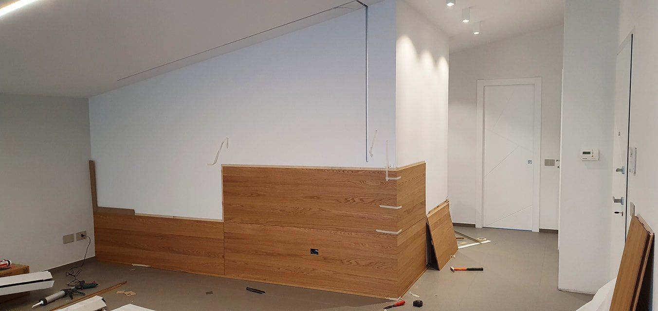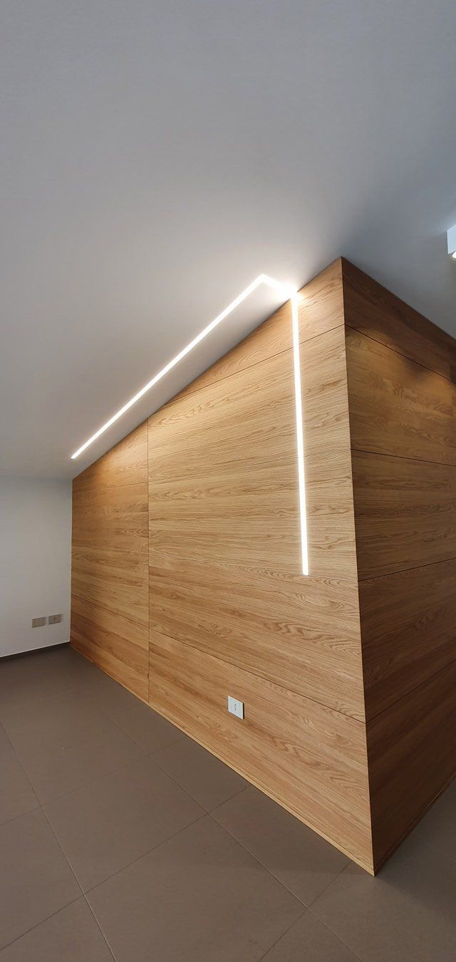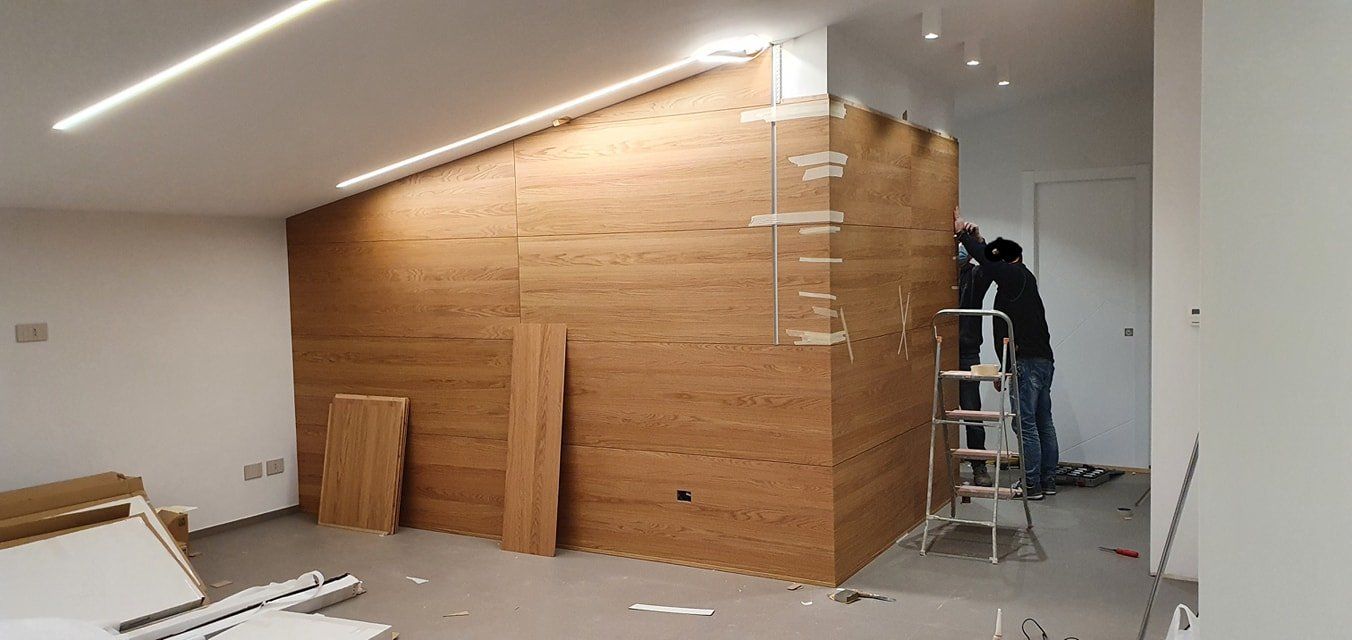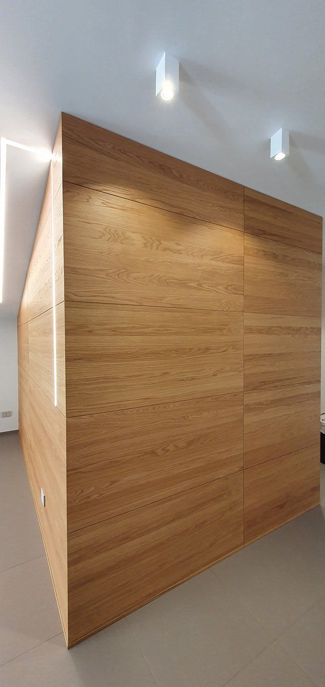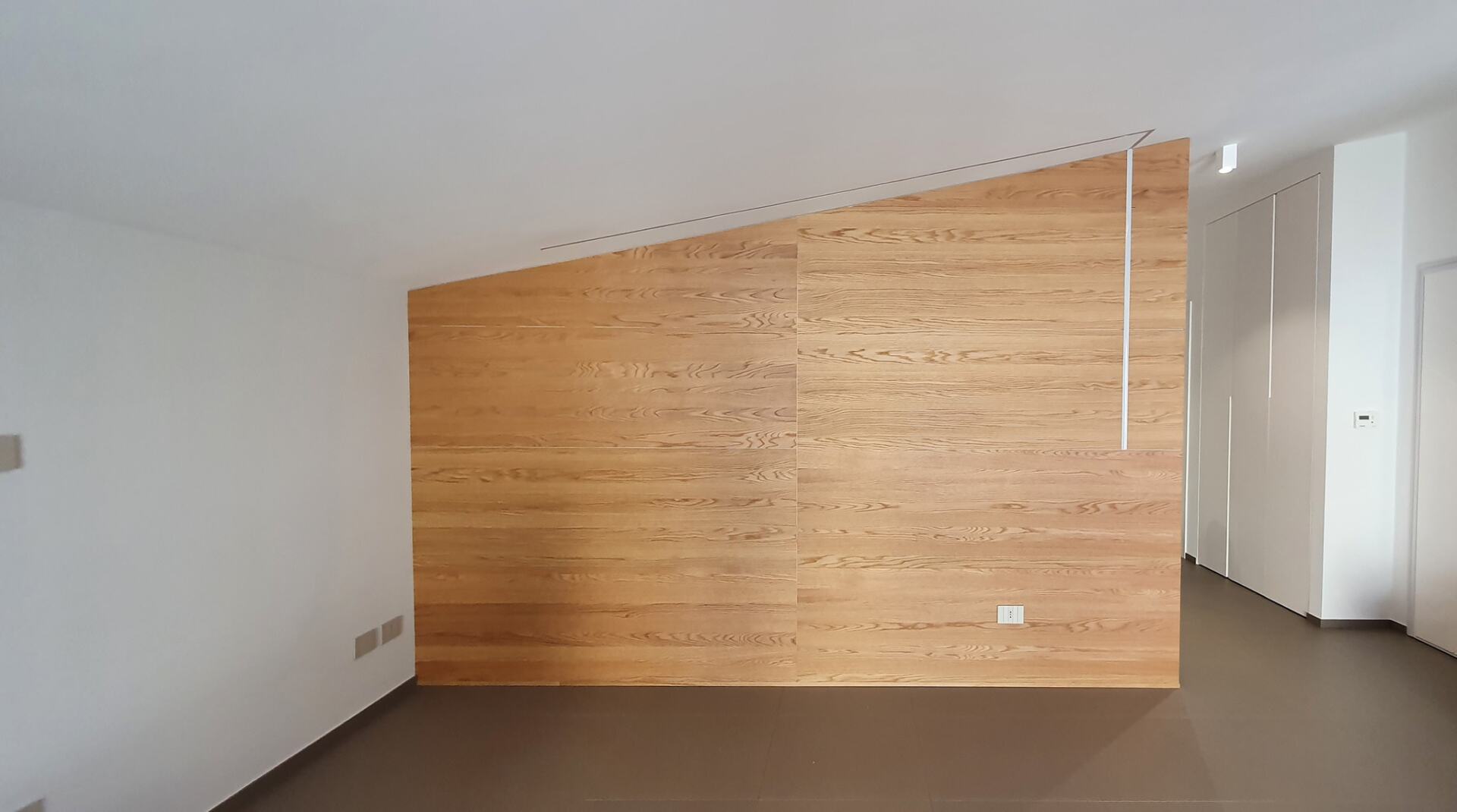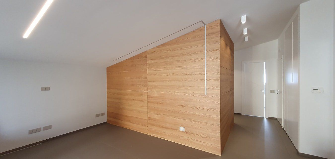 In questa abitazione, grazie alla fiducia dei ns clienti, abbiamo voluto dare un ruolo principale al legno come elemento di arredo rivestendo interamente le pareti con una boiserie in rovere caldo, della collezione Ambienti di Garofoli Group creando un total look inserendo anche le porte laccato bianco coll.Patio.