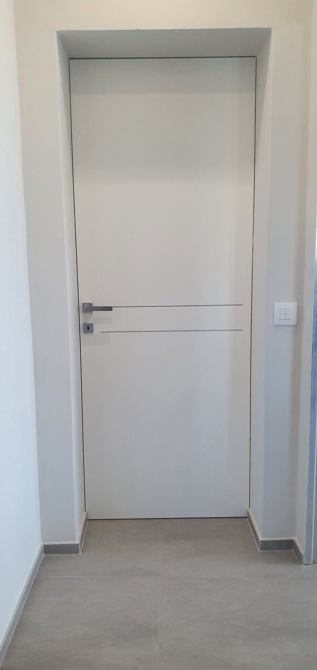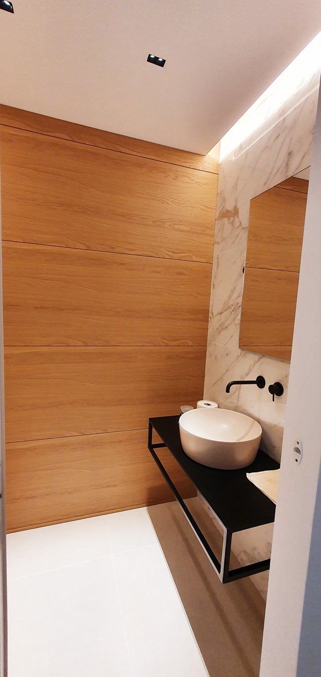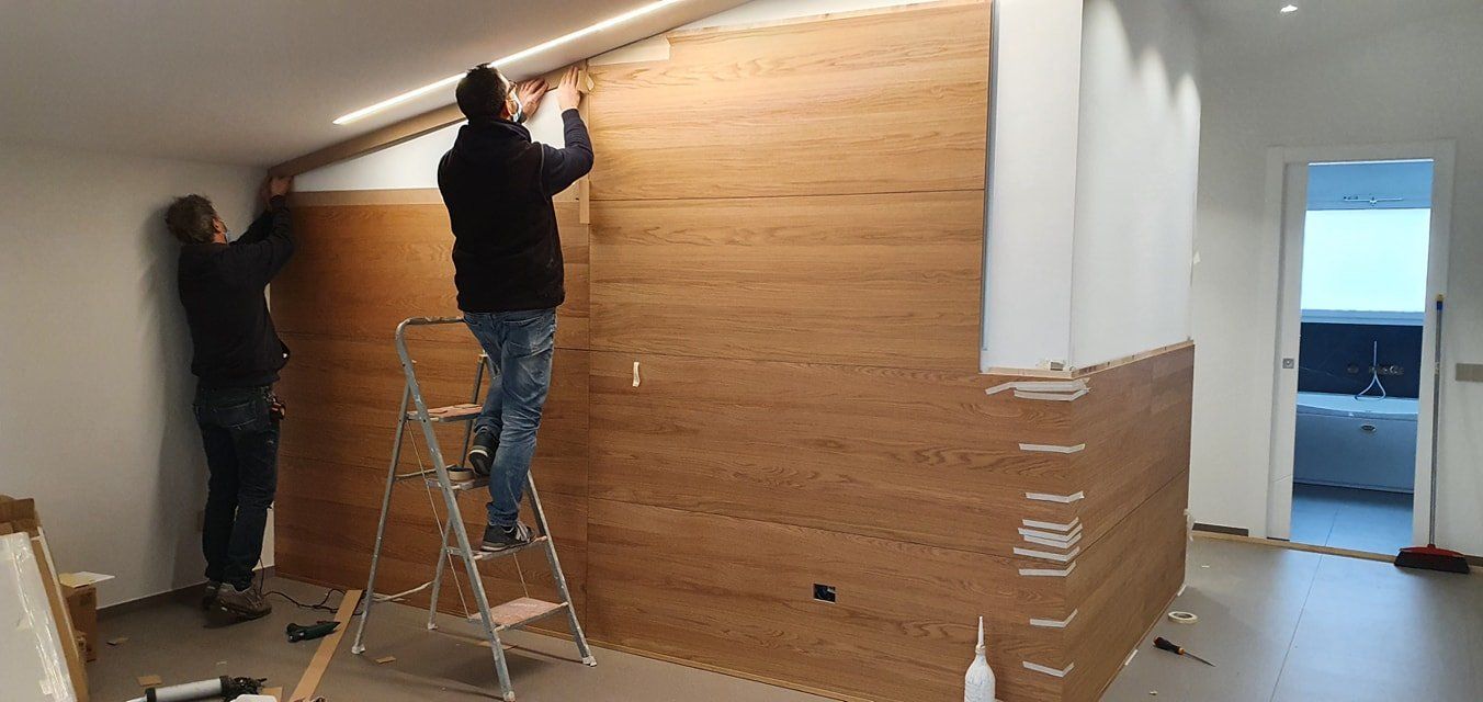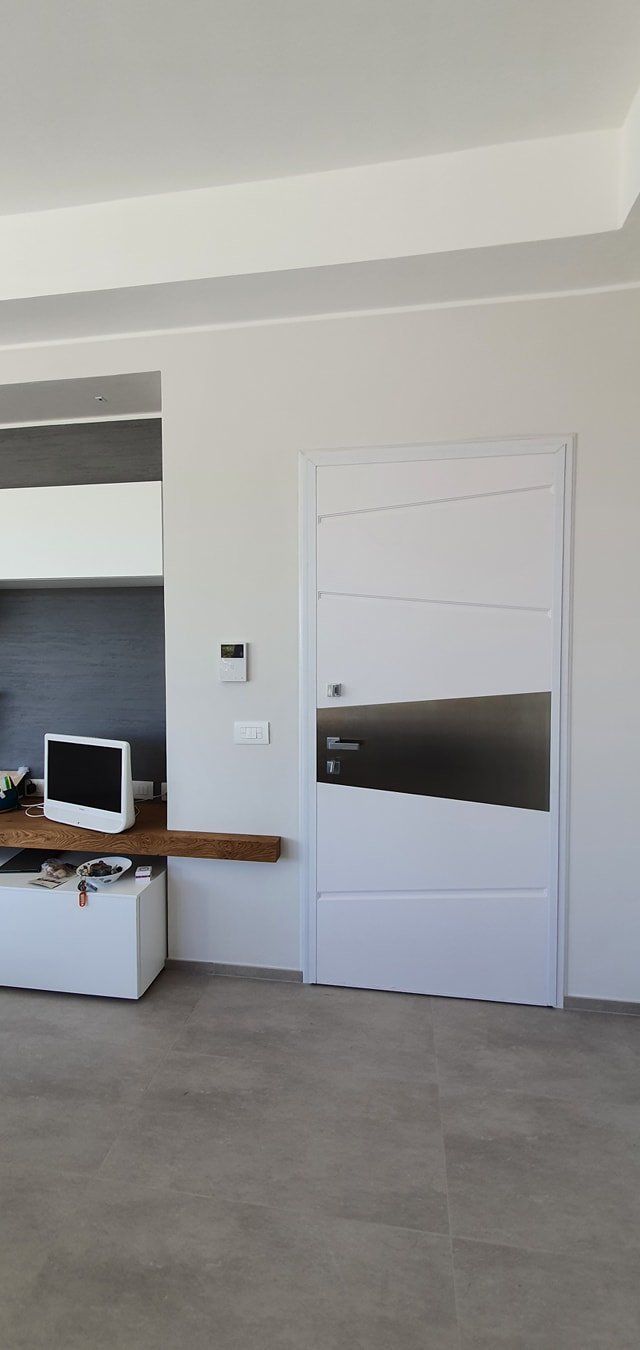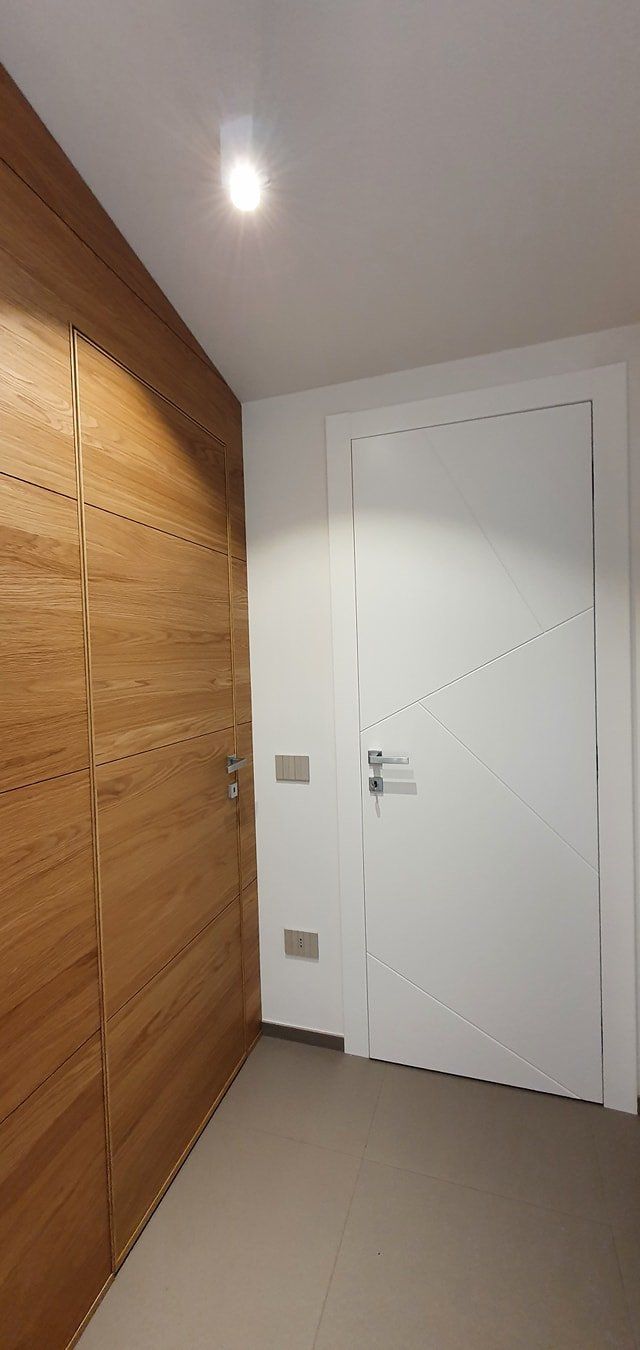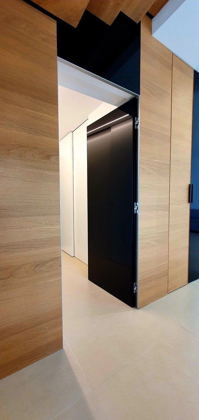 In questa abitazione, grazie alla fiducia dei ns clienti, abbiamo voluto dare un ruolo principale al legno come elemento di arredo rivestendo interamente le pareti con una boiserie in rovere caldo, della collezione Ambienti di Garofoli Group creando un total look inserendo anche le porte laccato bianco coll.Patio.