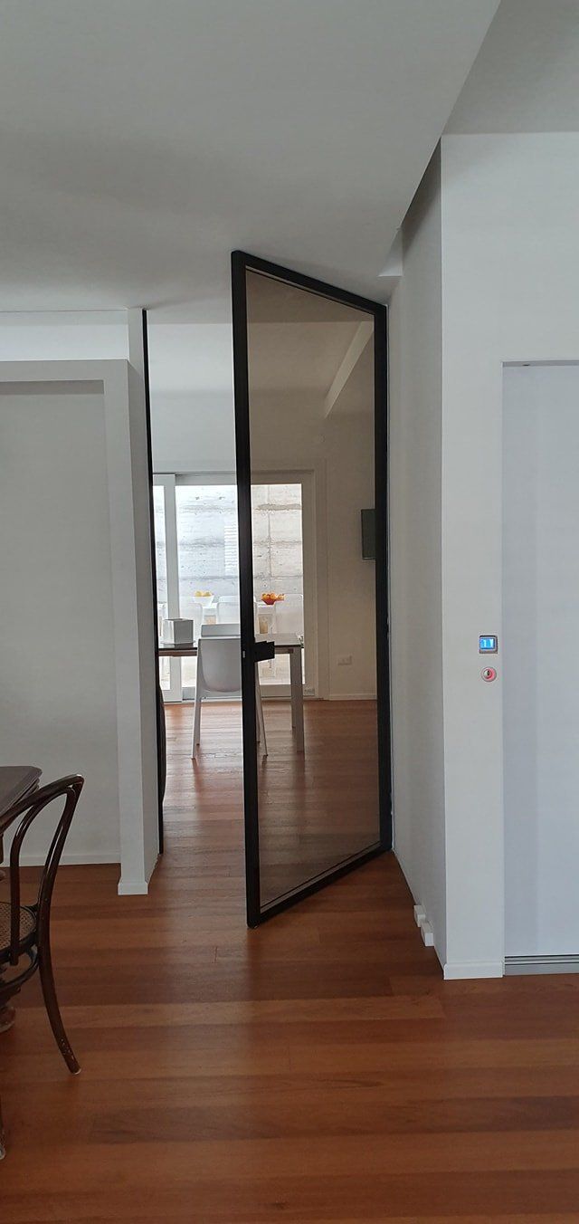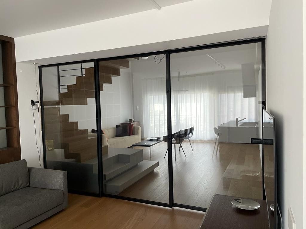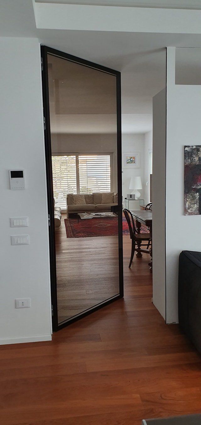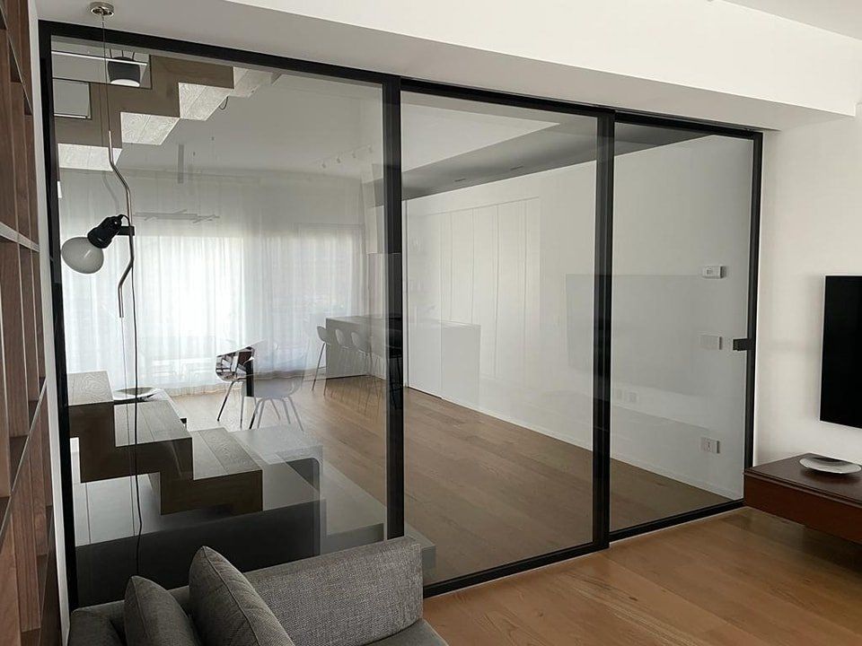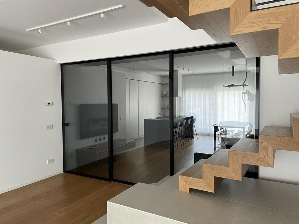 In un duplex dalla posizione favolosa, il living viene separato dalla cucina da ampie vetrate scorrevoli che grazie alla trasparenza rendono unico l'ambiente con eleganza.
