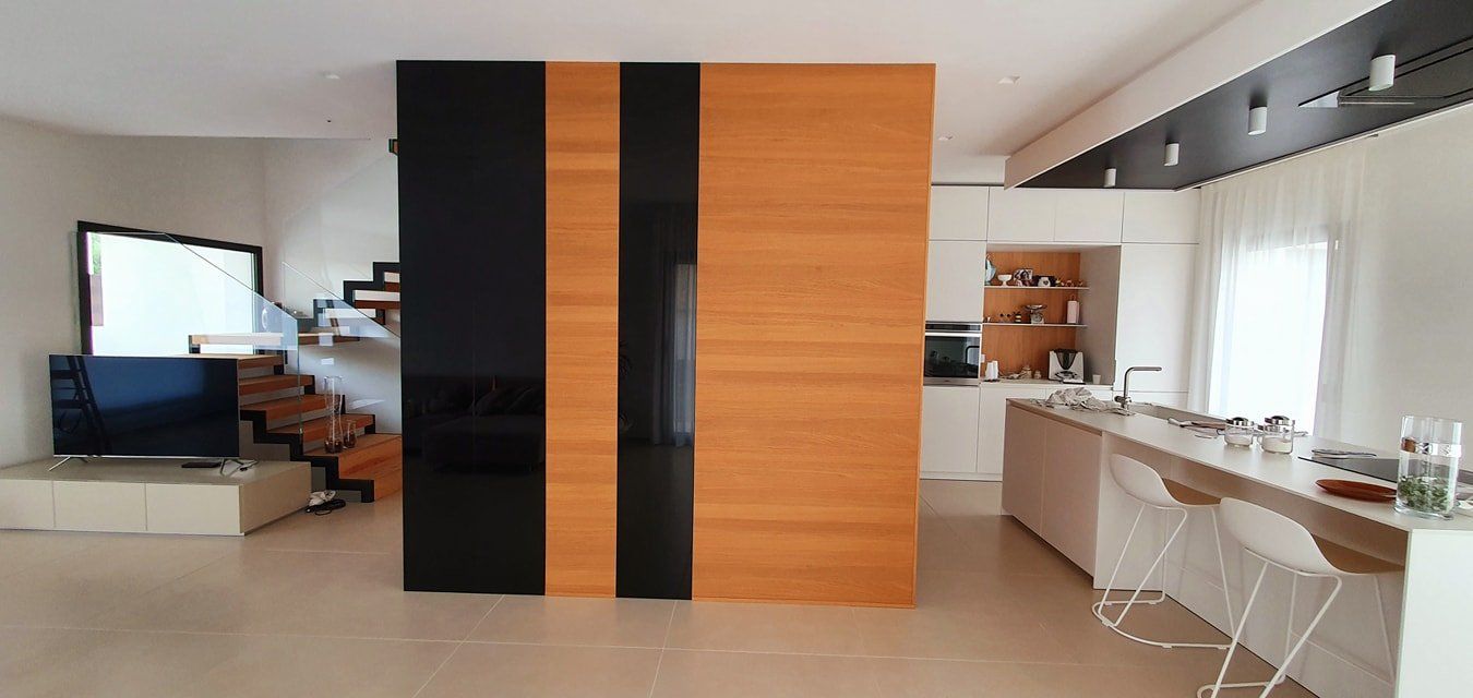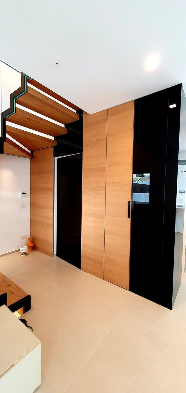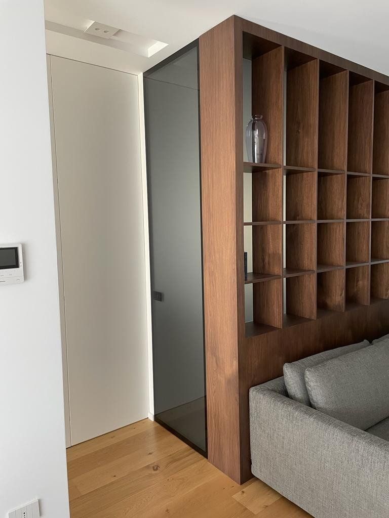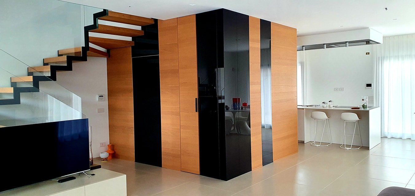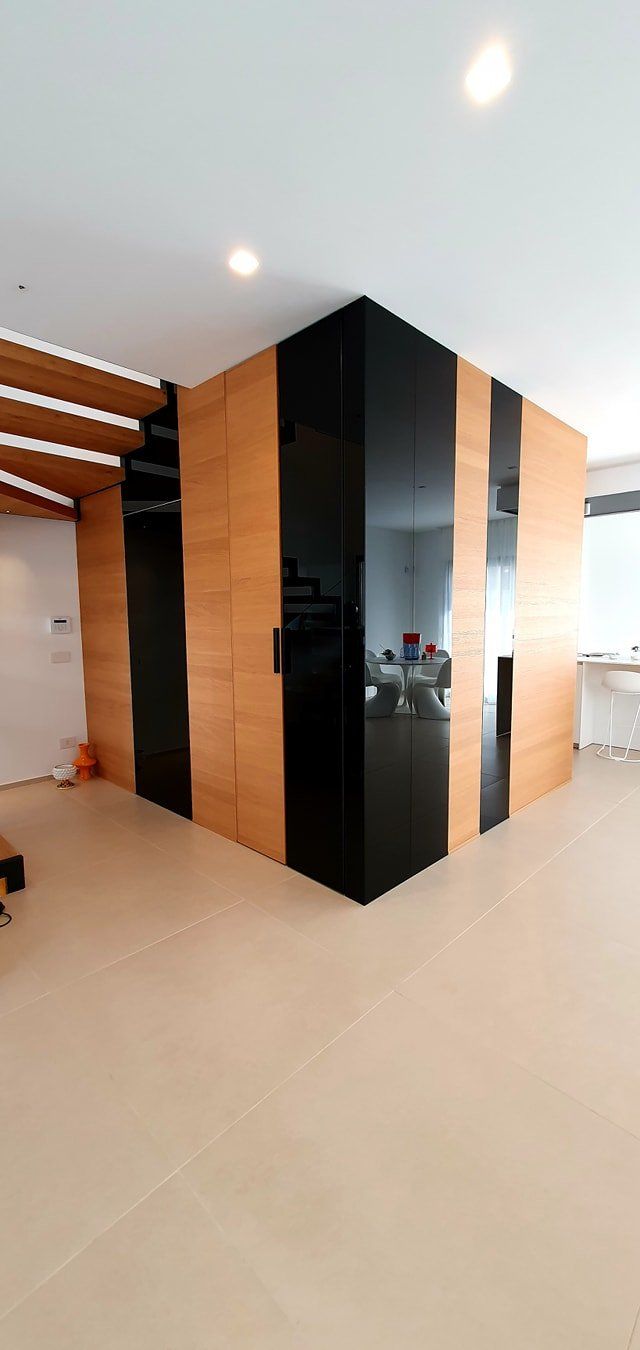 In questo progetto curato nei minimi dettagli il living viene arricchito dalla presenza di un disimpegno a forma di cubo contenitore che la fa da protagonista grazie al rivestimento delle pareti, contenenti porte ed armadi, che con l'alternarsi di vetro nero lucido e rovere naturale donano eleganza e unicità.