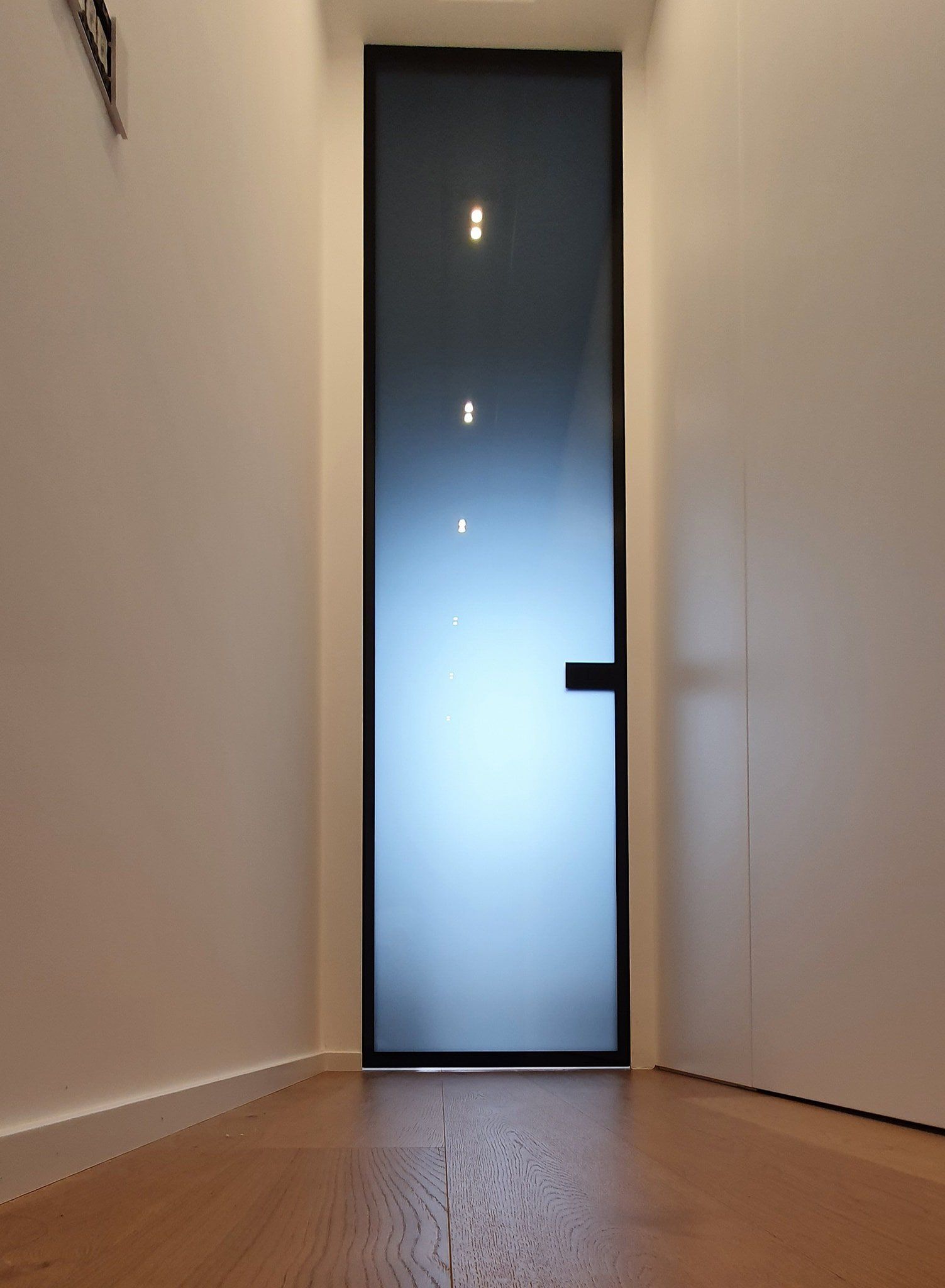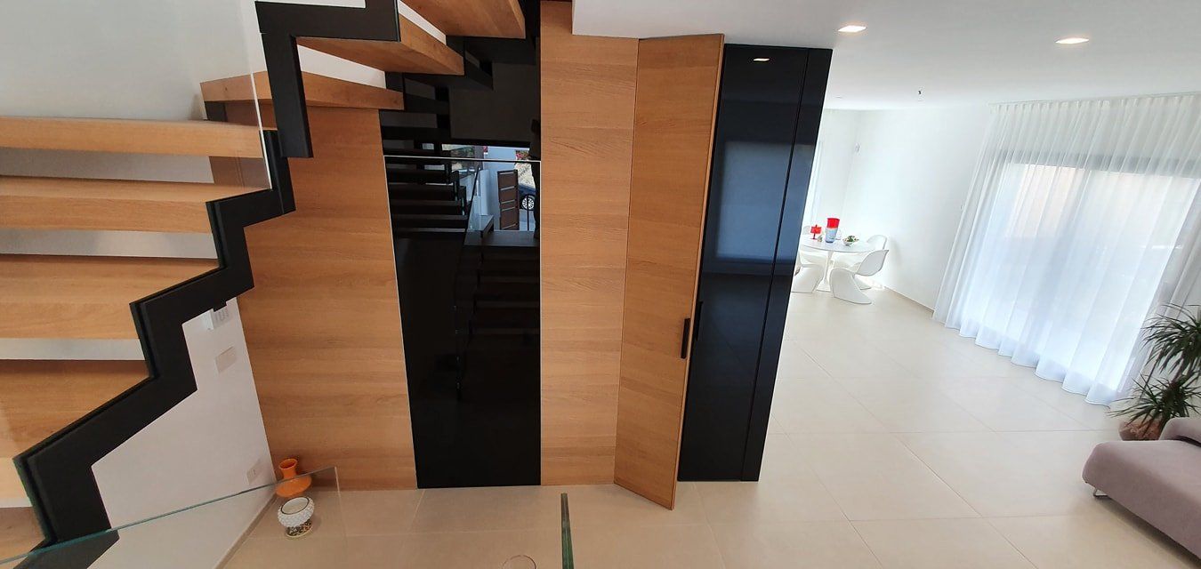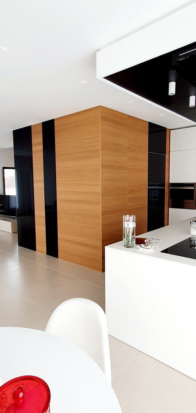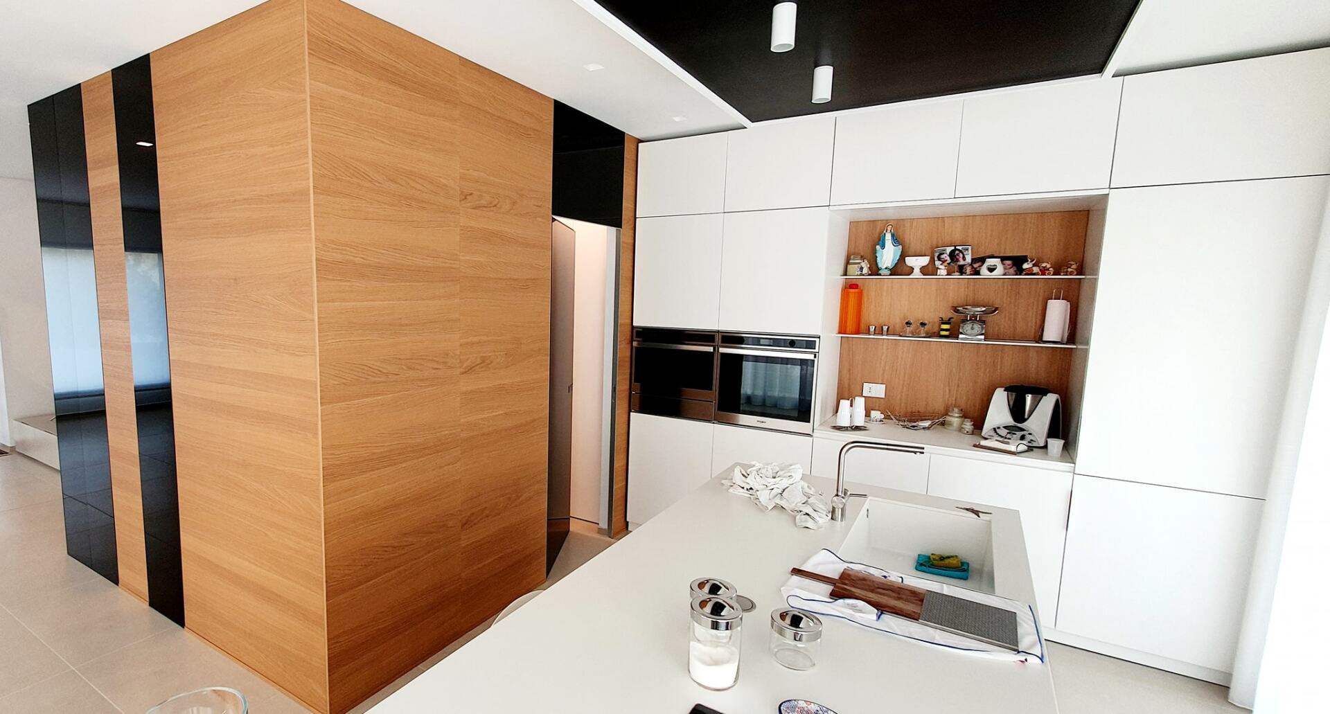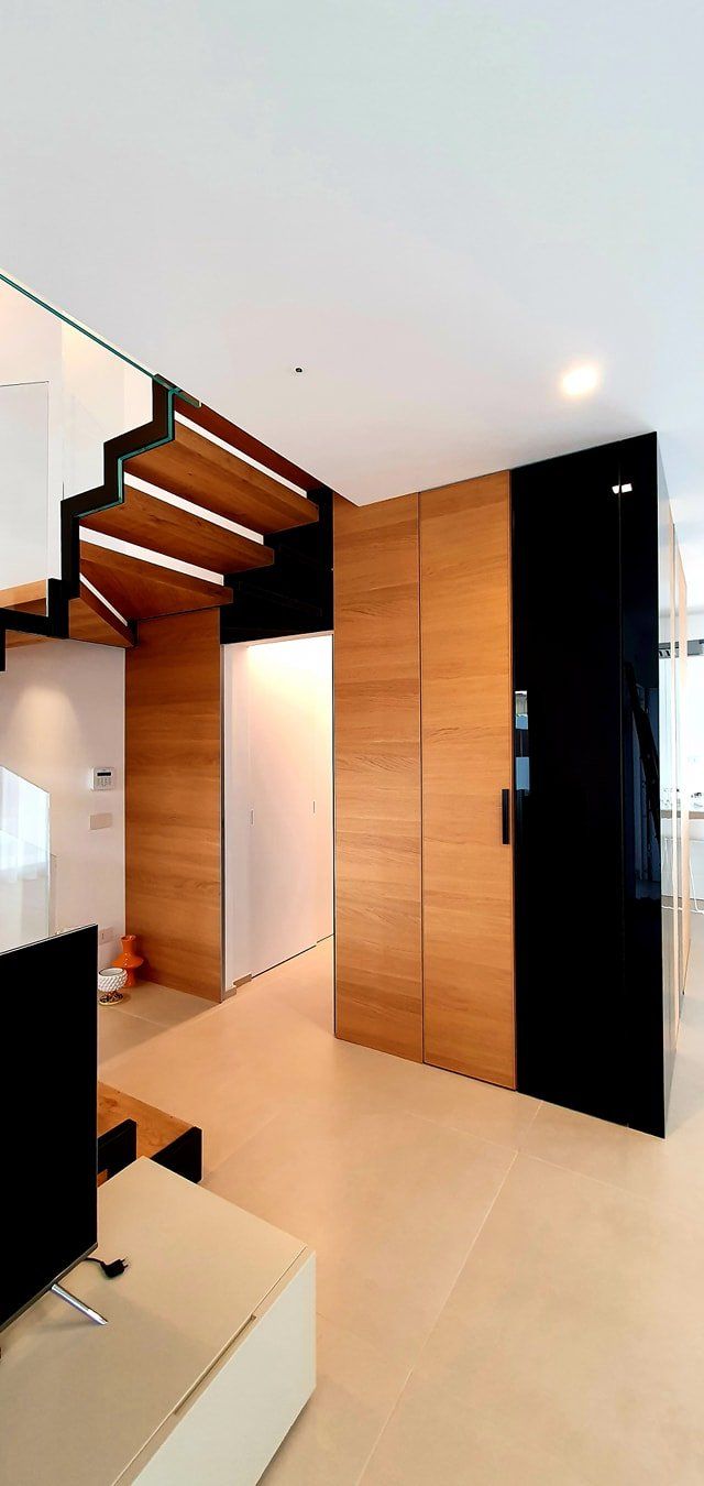 In questo progetto curato nei minimi dettagli il living viene arricchito dalla presenza di un disimpegno a forma di cubo contenitore che la fa da protagonista grazie al rivestimento delle pareti, contenenti porte ed armadi, che con l'alternarsi di vetro nero lucido e rovere naturale donano eleganza e unicità.